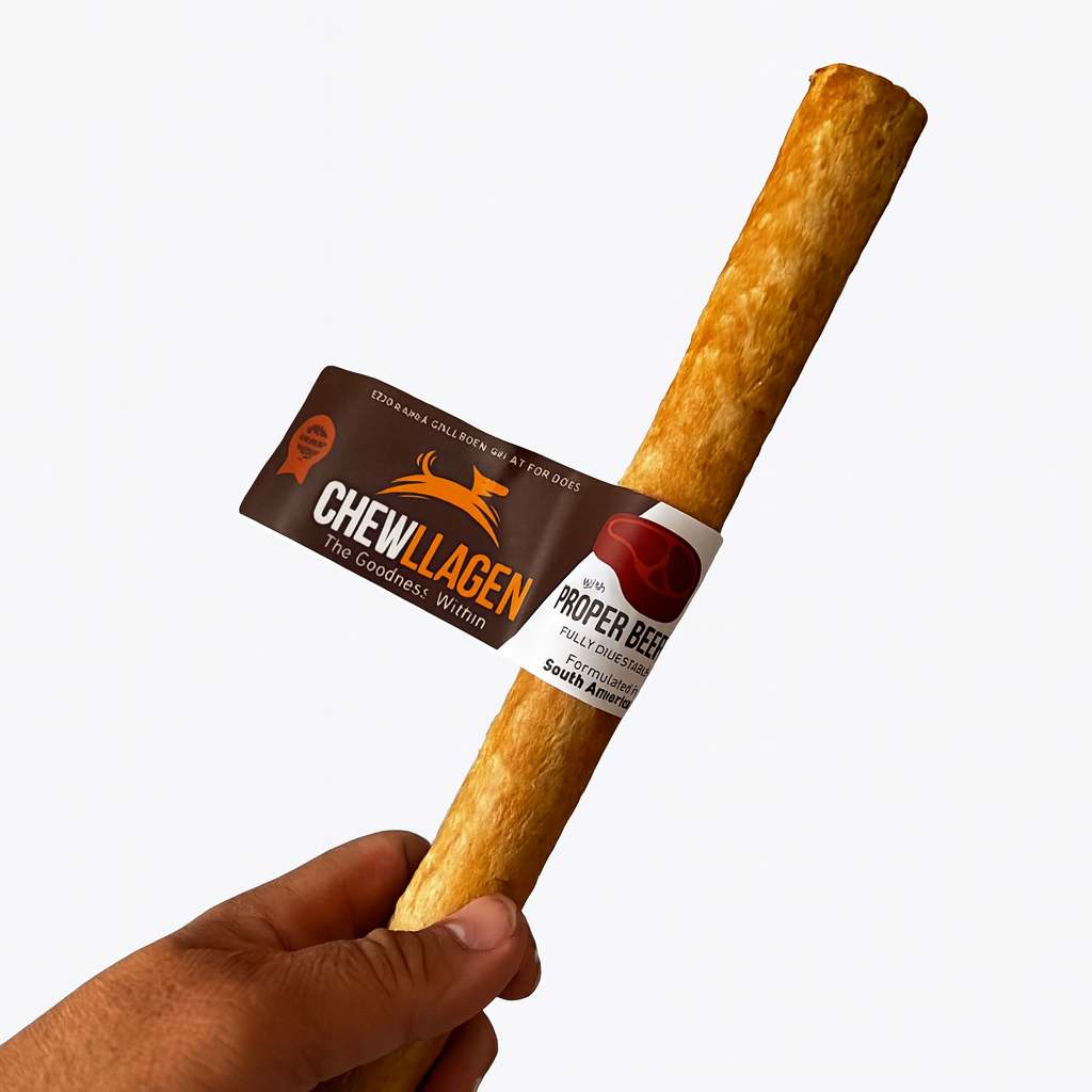 10 inch Chew Chewllagen is a dog treat made from collagen extracted from South American grass-fed cattle hide.