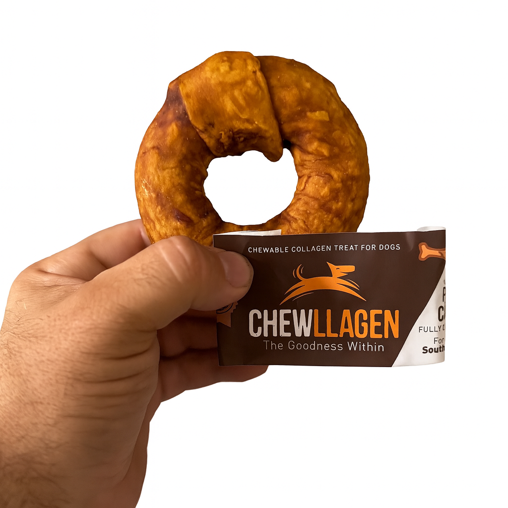 The collagen proteins are hydrolysed and broken down through a heating process into smaller and more easily digestible molecules. The collagen is then shaped and baked where it acquires its bread-like texture before being dipped in real beef. Collagen is the most abundant protein in the body and has many important functions, including the growth and repair of bones, tendons, ligaments, skin, and fur. As animals age, they produce less and lower-quality collagen. Consisting of mainly type 1 and type 3 collagen, Chewllagen stimulates cartilage production, cushioning joints and reducing joint pain. Not only does it aid your dog’s recovery after a long walk but also improves their muscular strength and power. In addition, Chewllagen also improves the gut health of your dog making it The Healthy Choice for your four-legged friend. Chewllagen is a great quick reward for all dogs, no matter their size or age, and is suitable suitable for young puppies (over 14 weeks) up to senior dogs.