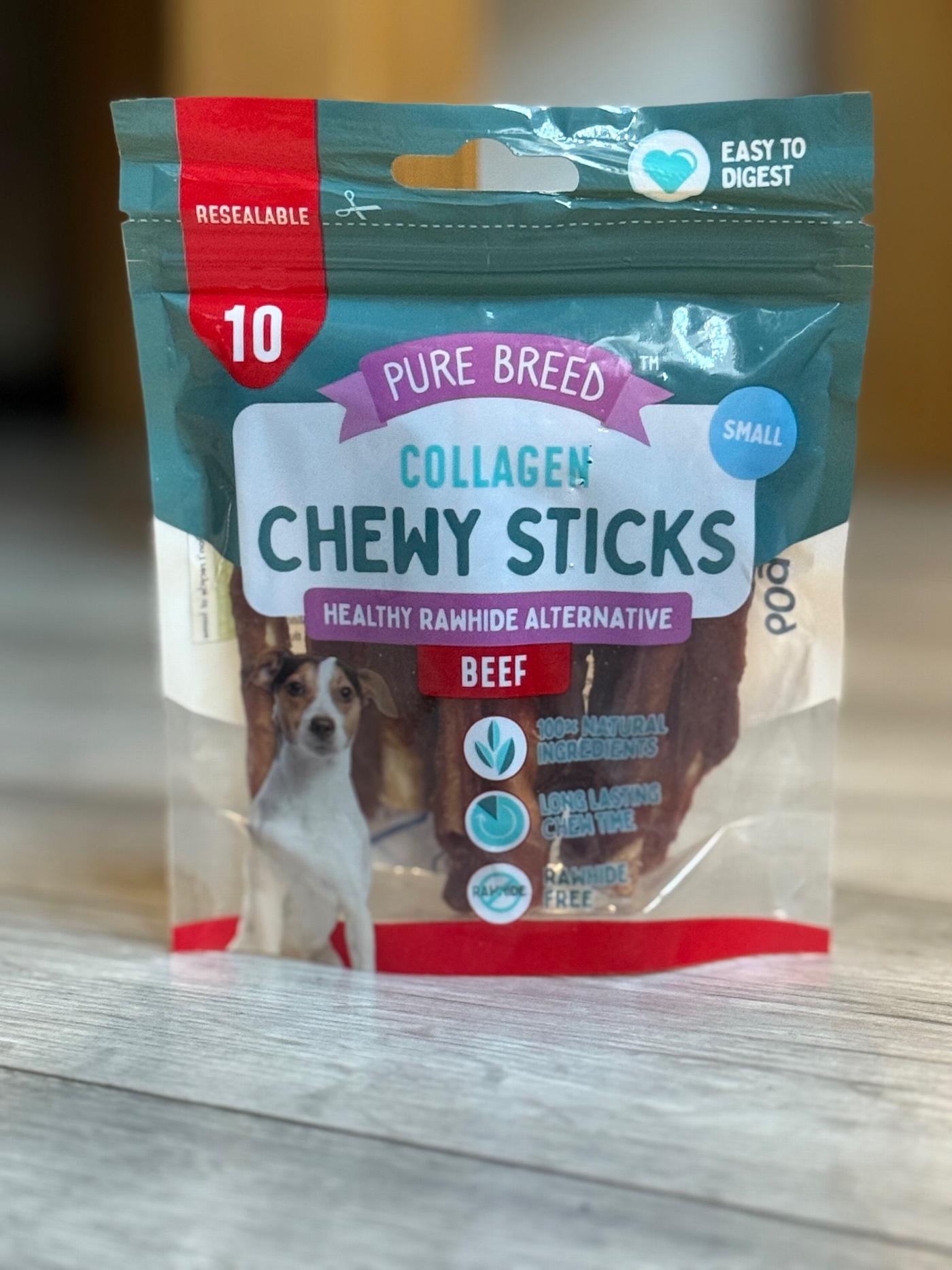 Indulge your furry friend with the Pure Breeds Beef flavoured mini collagan chew sticks dog treats 10 pack! Made with real Beef and collagen, these tasty chews not only satisfy your dog's cravings, but also support their joint health. Your dog will love the Beef flavour, and you'll love the added benefits. They are a healthy alternative to rawhide. These small-sized sticks are made from 100% natural ingredients and provide a long-lasting chew, perfect for small dogs.