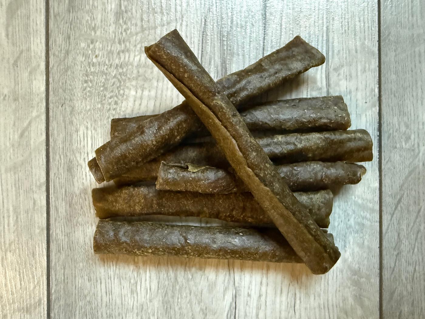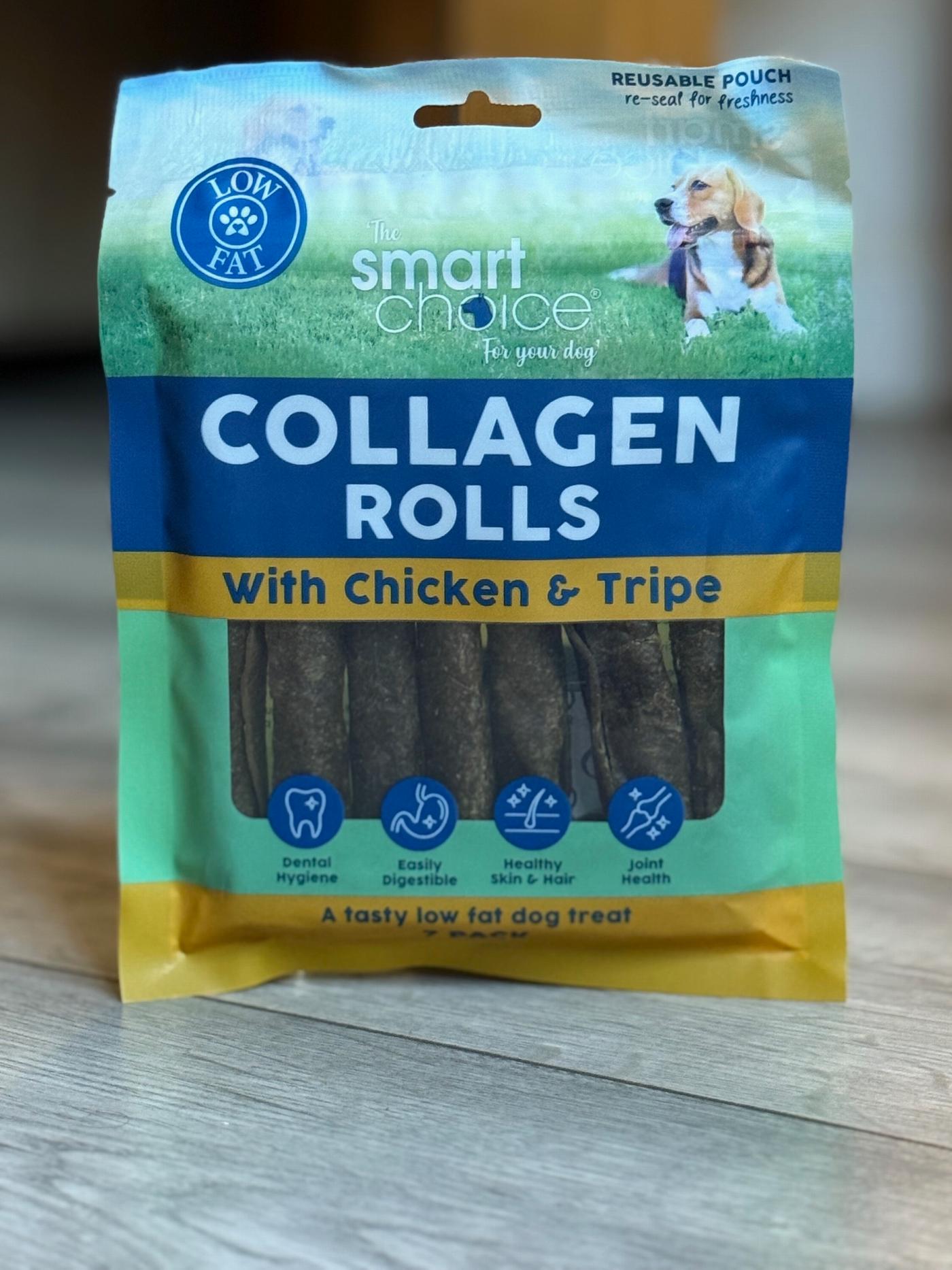 Collagen rolls with chicken and tripe. A tasty low fat, gluten free dog treat with vitamins and minerals. Perfect for a tasty snack or for rewarding good behaviour. Quality treats